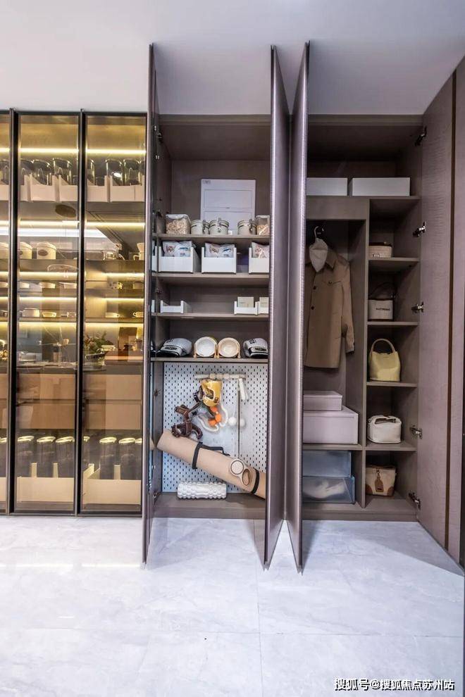 全面的收纳与精工细节:该户型同样注重收纳,配备超体量玄关柜,并对岛台、卫生间镜柜、主卧衣帽间等空间进行了系统化收纳设计。